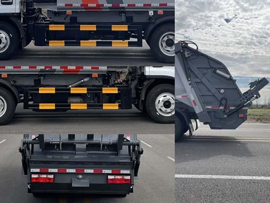 其它 該車裝備有垃圾箱體及垃圾裝填器,用于將垃圾自行裝入壓縮、轉運和卸料;僅采用軸距為:3308mm;選裝翻斗裝置時車長為6860mm,后伸量為390mm;選裝簸箕斗裝置時車長為6620mm,后伸量為180mm;側防護裝置材料為:Q235,側防護裝置與車架連接方式為螺栓連接;后下部防護為車輛部件代替,部件離地高度340mm;ABS型號及生產廠家:ABS/ASR-12V-4S/4M/襄陽東風隆誠機械有限責任公司;發動機型號與油耗值(L/100km)對應關系為:CY4BK461/16.2,CA4DB1-11E6/16.3,CY4BK161/16.2,D20TCIF1/16.3,D20TCIF1/16.3,Q28-130E60/15.9,H20-120E60/16.1,CA4DB1-13E6/16.2,YCY24140-60/16.3,Q23-115E60/14.5,ZD30D16-6N/16.3..選裝ETC車載裝置.