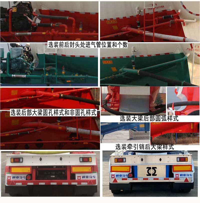 頂部封閉不可開槽,后部不可開啟;罐體有效容積:29.3立方米,運輸介質:干拌砂漿配料,密度:1170千克/立方米;當罐體外形尺寸罐體長(含封頭)8540mm,最大截面處寬2550mm,最大截面處高3100mm,前后封頭直徑為1810mm(選裝前后封頭直徑為1710mm),選裝罐體外形尺寸罐體長(含封頭)8050mm,最大截面處寬2550mm,最大截面處高3100mm,前后封頭直徑為1810mm(選裝前后封頭直徑為1710mm);當輪胎型號為11R22.5 14PR時,輪胎中間加裝雨簾;選裝走臺樣式,選裝后組合燈樣式,選裝車輛前部加裝機組,選裝爬梯安裝位置及個數(一個/兩個/三個),選裝前后封頭處進氣管位置和個數,選裝后部大梁圓孔樣式和非圓孔樣式,選裝大梁后部圓弧樣式,選裝牽引銷后大梁樣式;ABS系統生產廠家:廣州瑞立科密汽車電子股份有限公司,梁山順安達汽車科技有限公司,廣州市西合汽車電子裝備有限公司,型號:CM2XL-4S/2M,SAD-ABS4S/2M,XH-GQ4S2M-E01;側面及后下部防護裝置所用材料材質為:Q235,側面及后下部防護裝置與車輛連接方式均為:螺栓連接或焊接,后部防護裝置的主要尺寸參數:斷面尺寸(mm)為120×68,離地高度為:500mm;車長/牽引銷到車輛最前端距離/軸距/后懸對應關系為:9500/1470/4560+1310+1310/850,8720/690/4560+1310+1310/850,9500/1310/4800+1310+1310/770,8720/530/4800+1310+1310/770,9050/1210/4370+1310+1310/850,8300/460/4370+1310+1310/850,9050/1290/4370+1310+1310/770,8300/540/4370+1310+1310/770.