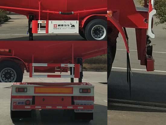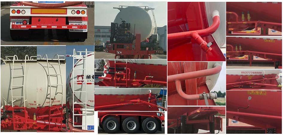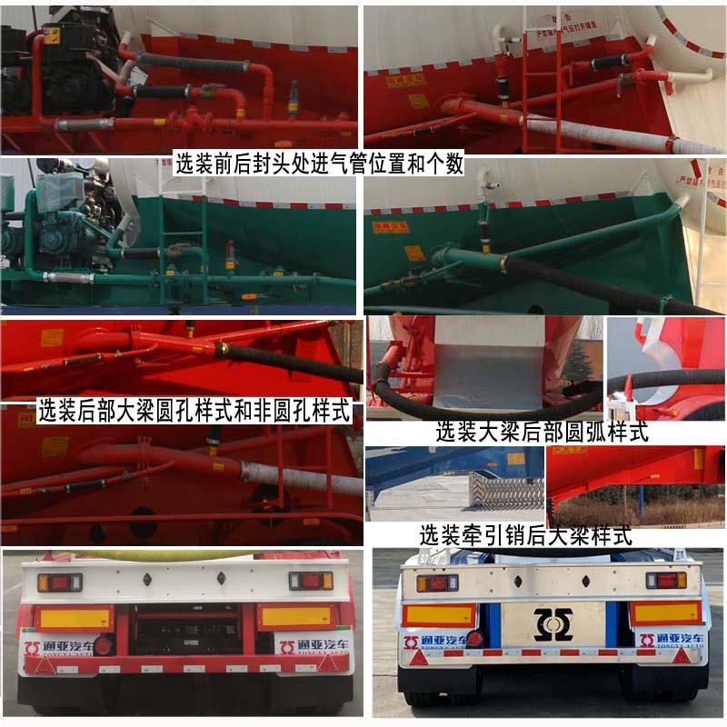 頂部封閉不可開槽,后部不可開啟;罐體總容量:45立方米,罐體有效容積:42.9立方米,運輸介質:干煤粉;當罐體外形尺寸罐體長(含封頭)10050mm,最大截面處寬2550mm,最大截面處高3180mm,前后封頭直徑為1910mm(選裝前后封頭直徑為2010mm);當輪胎型號為11R22.5 14PR時,輪胎中間加裝雨簾;選裝車輛前部加裝機組,選裝走臺樣式,選裝后組合燈樣式,選裝前位燈樣式,選裝爬梯安裝位置及個數(一個/兩個/三個),選裝前后封頭處進氣管位置和個數,選裝大梁圓孔樣式和非圓孔樣式,選裝大梁后部圓弧樣式,選裝牽引銷后大梁樣式,選裝管道樣式,選裝機組樣式,選裝外觀樣式;ABS系統生產廠家:廣州瑞立科密汽車電子股份有限公司,梁山順安達汽車科技有限公司,廣州市西合汽車電子裝備有限公司,山東梁山德爾福汽車科技有限公司,型號:CM2XL-4S/2M,SAD-ABS4S/2M,XH-GQ4S2M-E01,DEF-ABS4S/3M;側面及后下部防護裝置所用材料材質為:Q235,側面及后下部防護裝置與車輛連接方式均為:螺栓連接或焊接,后部防護裝置的主要尺寸參數:斷面尺寸(mm)為120×68,離地高度為:500mm;車長/牽引銷到車輛最前端距離/軸距/后懸對應關系為:10950/1470/5430+1310+1310/1430,10200/720/5430+1310+1310/1430,10950/1700/5200+1310+1310/1430,10200/950/5200+1310+1310/1430,10950/1650/5700+1310+1310/980,10200/900/5700+1310+1310/980. |