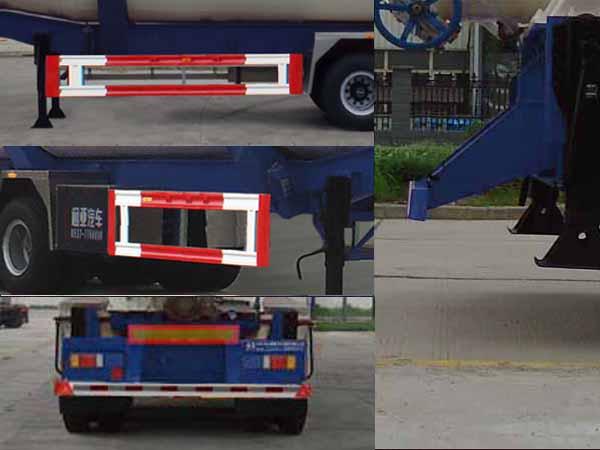 其它 罐體總容量:55立方米,罐體有效容積:52.4立方米;運輸介質:煙煤粉,介質堆密度:570千克/立方米,罐體長:12250mm,前端直徑:2300mm,后端直徑:2500mm.ABS系統生產廠家:廣州瑞立科密汽車電子股份有限公司,梁山順安達汽車科技有限公司,山東梁山德爾福汽車科技有限公司,型號:CM2XL-4S/2K(4S/2M),SAD-ABS4S/2M,DEF-ABS4S/3M;側面及后下部防護裝置所用材料材質為:Q235,側面及后下部防護裝置與車輛連接方式均為:螺栓連接或焊接,后部防護裝置的主要尺寸參數:斷面尺寸(mm)為120×68,離地高度為:500mm.頂部封閉不可開槽,后部不可開啟.