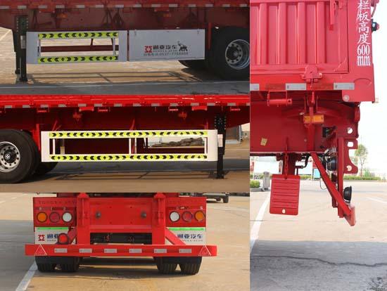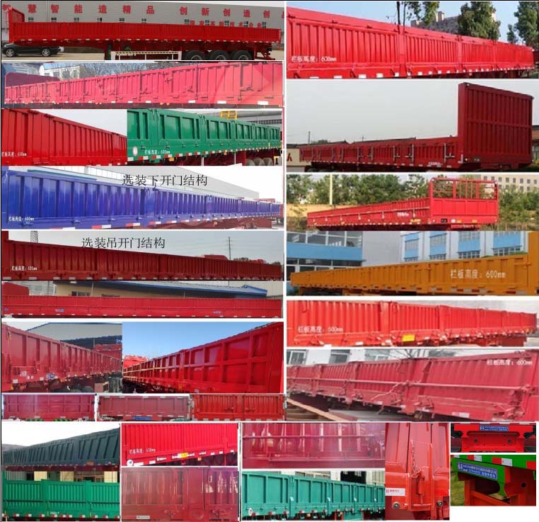 貨方式為:側卸;安裝有手動鎖緊機構;選后組合燈為矩形樣式,選裝后霧燈圓形樣式,選裝尾部標志板安裝位置,每側可選4扇門,5扇門,6扇門,選裝欄板結構為下開門,吊開門結構,橫瓦楞,豎瓦楞,方管十字花樣式,選裝前檔板結構,選裝側面樣式,選裝后部樣式,立柱可選內插,外插樣式,選裝包角樣式及合頁樣式;ABS系統生產廠家:廣州瑞立科密汽車電子股份有限公司,梁山順安達汽車科技有限公司,廣州市西合汽車電子裝備有限公司,山東梁山德爾福汽車科技有限公司,型號:CM2XL-4S/2M,SAD-ABS4S/2M,XH-GQ4S2M-E01,DEF-ABS 4S/3M;側面及后下部防護裝置所用材料材質為:Q235,側面及后下部防護裝置與車輛連接方式均為焊接,后部防護裝置的主要尺寸參數:斷面尺寸(mm)為140×50,離地高度為:480mm;車長/牽引銷到車輛最前端距離/軸距/后懸對應關系為:13000/1200/6880+1310+1310/2300,13000/1300/6780+1310+1310/2300,13000/1400/6680+1310+1310/2300,12500/1300/6480+1310+1310/2100,12000/1200/6380+1310+1310/1800.