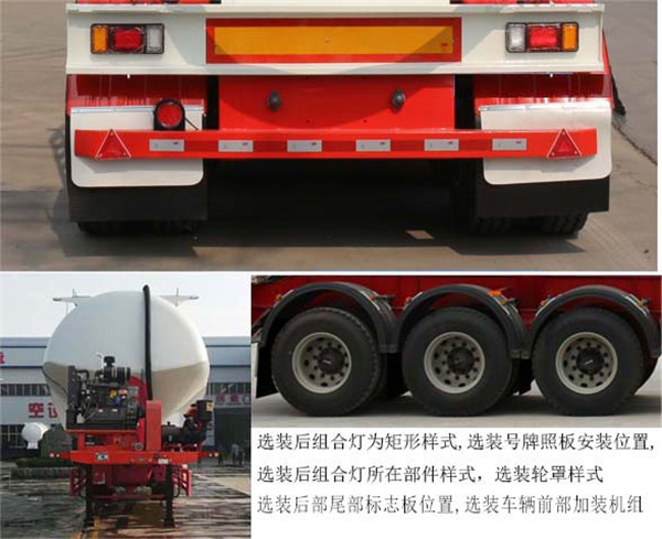部封閉不可開槽,后部不可開啟;罐體總容量:48立方米,罐體有效容積:46立方米;罐體外形尺寸A型:罐體長(含封頭)10500mm,寬2550mm,最大截面處高度3250mm,前后封頭直徑2550mm,選裝罐體外形尺寸B型:罐體長(含封頭)11100mm,寬為2550mm,最大截面處高度3250mm,前后封頭直徑2550mm,選裝罐體外形尺寸C型:罐體長(含封頭)12300mm,寬為2550mm,最大截面處高度3250mm,前后封頭直徑2550mm;整車長度(mm)為:13000,加裝機組,罐體外形尺寸為B型、C型;整車長度(mm)為:12300,加裝機組,罐體外形尺寸為A型,不加裝機組,罐體外形尺寸為B型、C型;整車長度(mm)為:11650,不加裝機組,罐體外形尺寸為A型;選裝后組合燈為矩形樣式,選裝號牌照板安裝位置,選裝后組合燈所在部件樣式,選裝管道樣式及罐體椎體個數,選裝升降式扶梯,選裝輪罩樣式,選裝后部尾部標志板位置,選裝車輛前部加裝機組,選裝前封頭下部大梁樣式,選裝卸口位置(側面或后側),選裝空氣懸架,選裝上部出料管結構,選裝前端加裝吊桿樣式,選裝進氣管道樣式;ABS系統生產廠家:廣州瑞立科密汽車電子股份有限公司,梁山順安達汽車科技有限公司,廣州市西合汽車電子裝備有限公司,山東梁山德爾福汽車科技有限公司,型號:CM2XL-4S/2M,SAD-ABS4S/2M,XH-GQ4S2M-E01,DEF-ABS4S/3M;側面及后下部防護裝置所用材料材質為:Q235,側面及后下部防護裝置與車輛連接方式均為:螺栓連接或焊接,后部防護裝置的主要尺寸參數:斷面尺寸(mm)為120×68,離地高度為:500mm,選裝側面防護裝置所用材料材質為:鋁合金,與車架連接方式為螺栓連接;車長/牽引銷到車輛最前端距離/軸距/后懸對應關系為:11650/455/7650+1310+1310/925,12300/1105/7650+1310+1310/925,12300/455/8400+1310+1310/825,13000/1155/8300+1310+1310/925,13000/1155/8400+1310+1310/825,12300/805/7950+1310+1310/925,13000/1505/7950+1310+1310/925.
